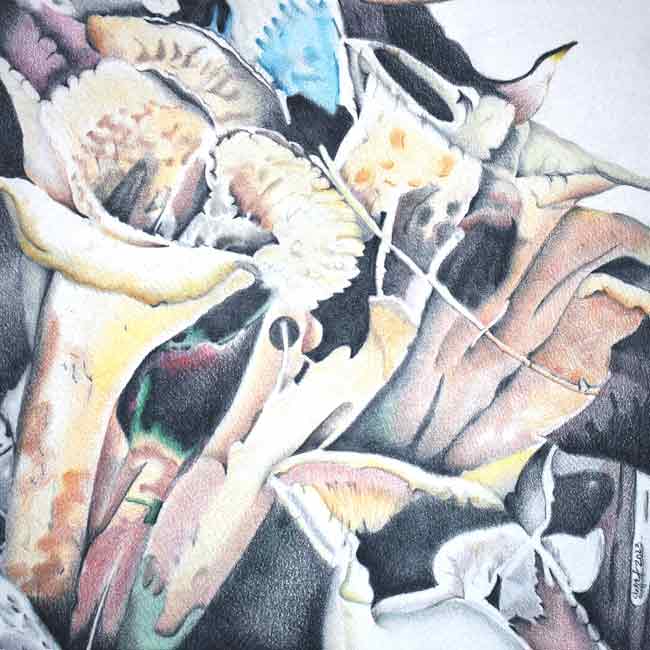 Trumpet Mushrooms, 2023 colored pencil,12″ x 12″/Angel Beth Smith