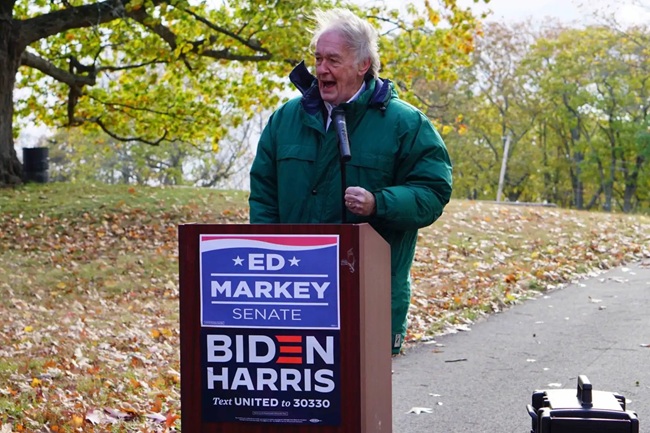 Sen. Ed Markey, in Franklin Park in Dorchester, making a get-out-the-vote pitch on the day before Election Day in 2020. (Photo by Michael Jonas)