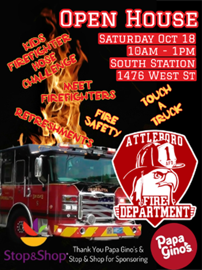 This Open House commemorates National Fire Safety Month (October). Participants will receive safety tips such as “stop, drop and roll,” learn how to plan escape routes and how to crawl safely through a smoke filled room. In addition, Papa Gino’s, the Attleboro-based pizza chain, will provide free pizza at the Open House while supplies last. To include Attleboro Stop & Shop providing drinks while supplies last. Thank you to both for their support of this much anticipated event.
