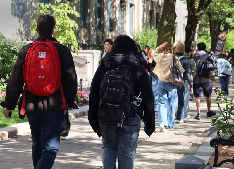 Boston University students walk in front of the College of Arts and Sciences between classes in Boston. (Maria Pemberton/CommonWealth Beacon)