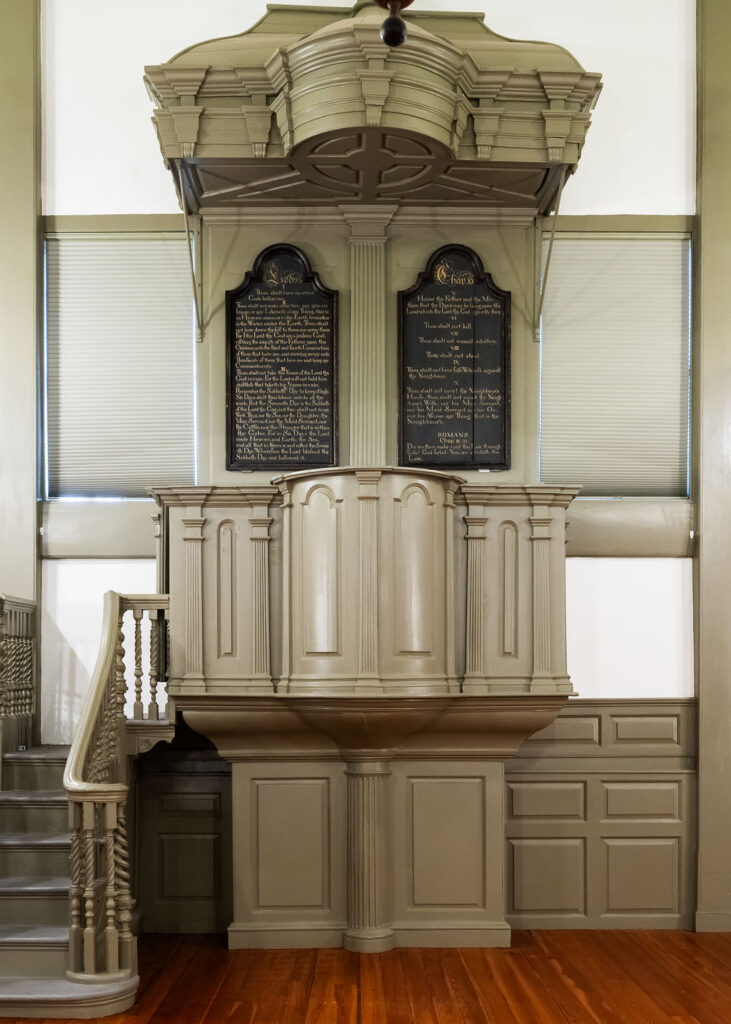 The meeting house itself was constructed with a deliberately plain exterior in keeping with the style of Dissenting Protestant groups of the time period, though the ornate interior may hint at some design influence from more elaborate Anglican churches.[6] The interior has a distinctive “wine glass” pulpit and finely carved balusters leading up to the pulpit and the balcony. These architectural features, which bear a striking similarity to those of Newport’s Trinity Church and may even have been carved with the same tools, indicate that the two buildings were likely designed by the same person, Richard Munday.[7] The walls were originally red-stained wood before being painted green in 1773.[8] The wooden tablets that currently hang above the pulpit were added in the same year and emphasize the centrality of the Ten Commandments to Sabbatarian worship. The Seventh Day Baptists would have worshipped in box pews that were located on the ground floor as well as on the upper balcony, where some congregants carved their initials and nautical scenes during services. The pews no longer exist in their original form but were made into the wainscotting on the walls of the building during an 1884 renovation.[9]