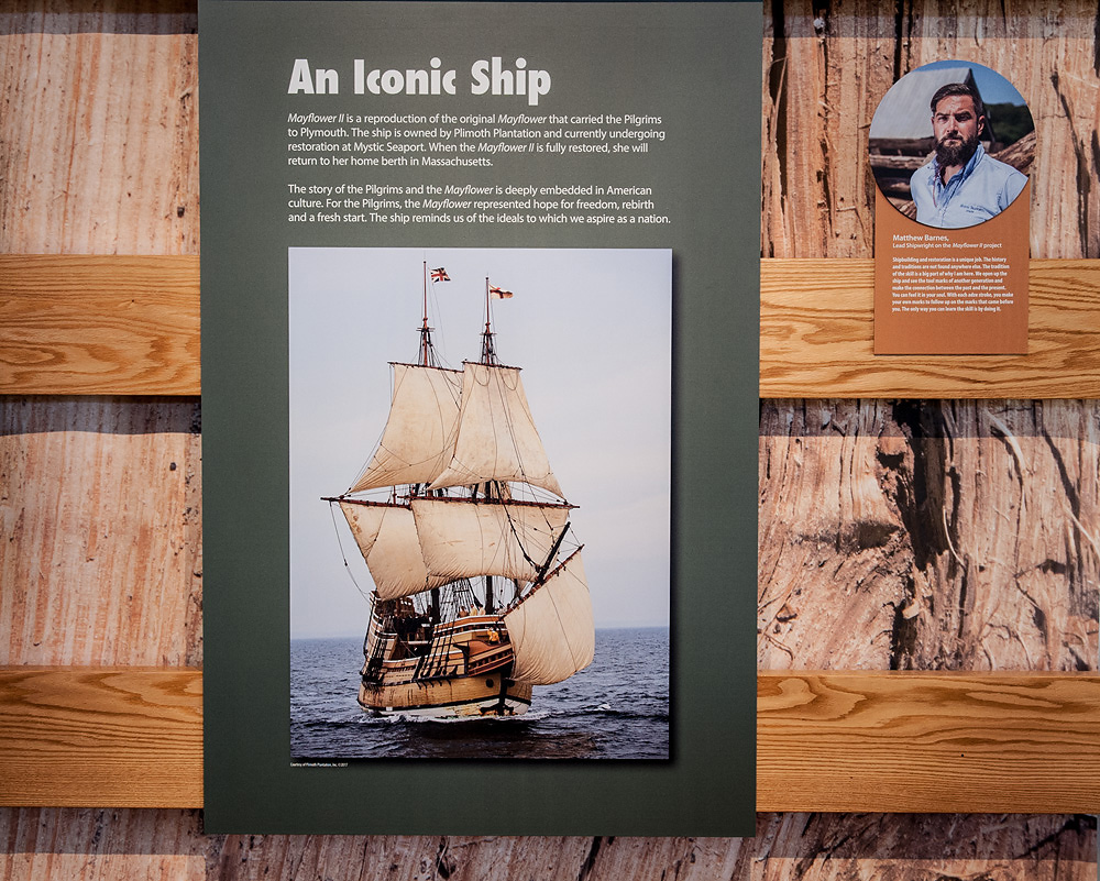 Through touch, sound, and sight, visitors are brought deeply (but safely) into the story. In addition to highlighting past projects, the Shipyard Gallery also includes a changing section devoted to the current major project. The first offering in this area is a look at the restoration of Mayflower II, owned by Plimoth Patuxet.