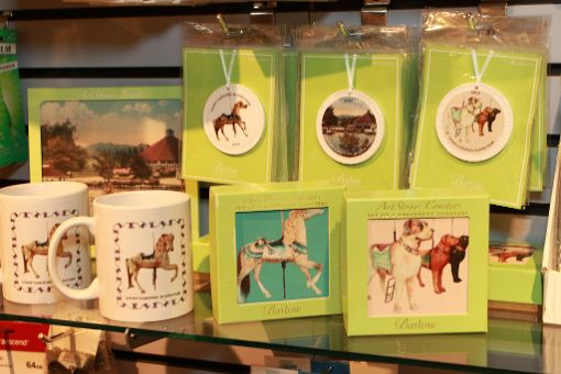 Other items include a portrait of carousel carver, Charles I.D. Looff, who is featured on a trivet, a set of boxed coasters featuring four carousel horses or four menagerie figures are also available for $15.00 and a mug featuring a carousel horse for $10.00 as well as carousel postcards.