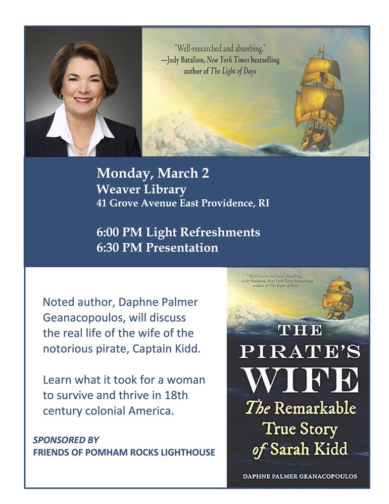 Friends of Pomham Rocks Lighthouse welcomes Dr. Daphne Palmer Geanacopoulos to Weaver Library for an evening of fascinating insights into the life of Sarah Kidd, the wife of the notorious Captain William Kidd. An American women’s historian with an interest in maritime history, she will discuss her book, The Pirate’s Wife: The Remarkable True Story of Sarah Kidd.