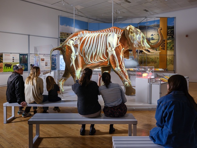 Peek inside a life-size elephant projection to see its skeleton, heartbeat, and how it digests up to 500 pounds of food a day.